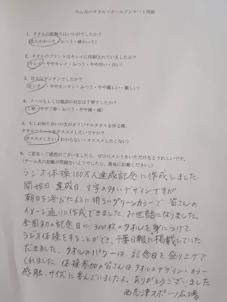以下、タオルツクールのアンケート用紙になります。